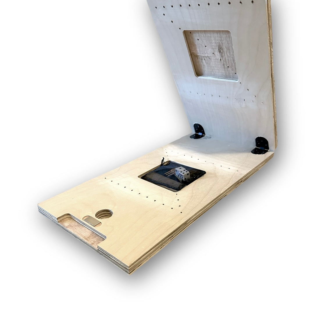 Our most portable and affordable folding board model. It's hinged at the center for magnetic closure and has a square cutout on the back side of the board to store game pieces when folded.